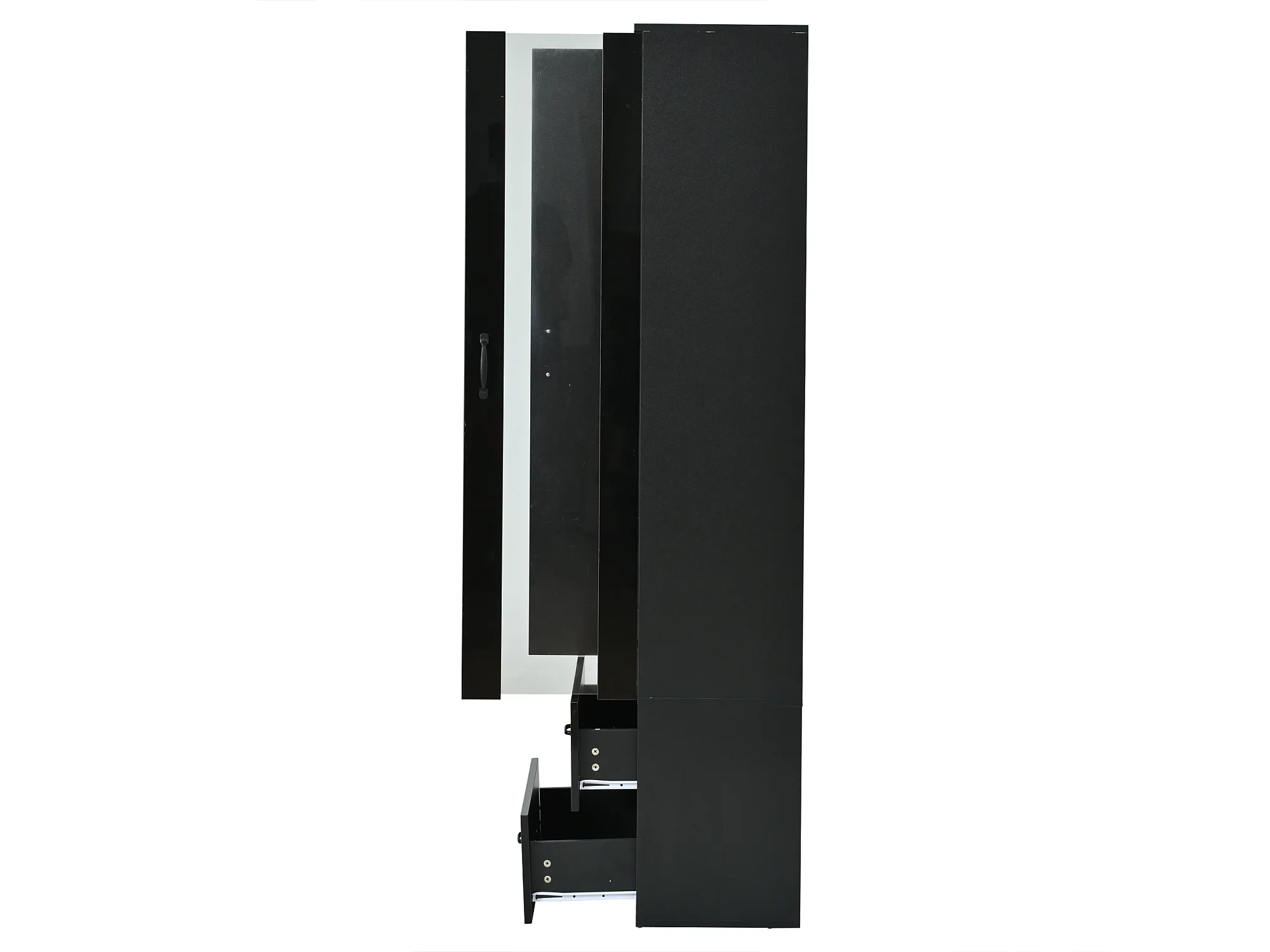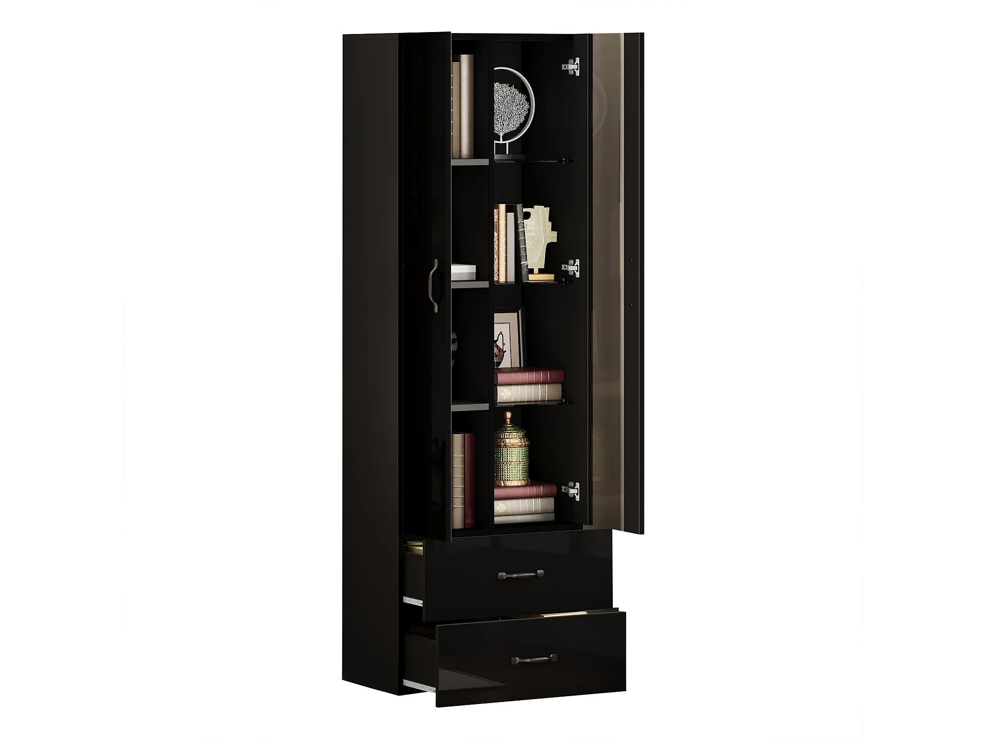 Vitrine mit transparenter Tür – 60 x 35 x 182,5 cm – mit LEDs + 2 Türen + 2 Schubladen – Spanplatte – schwarz