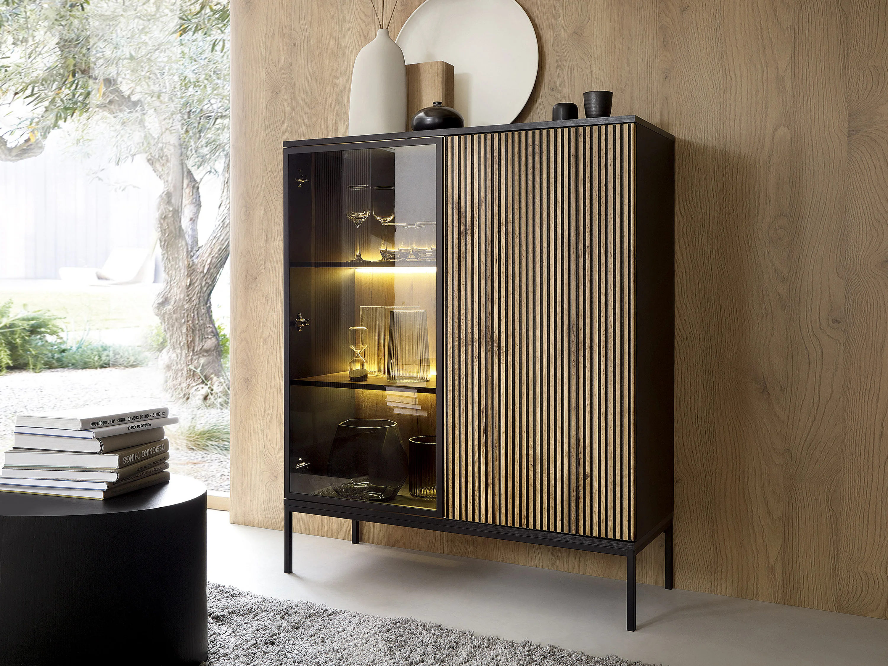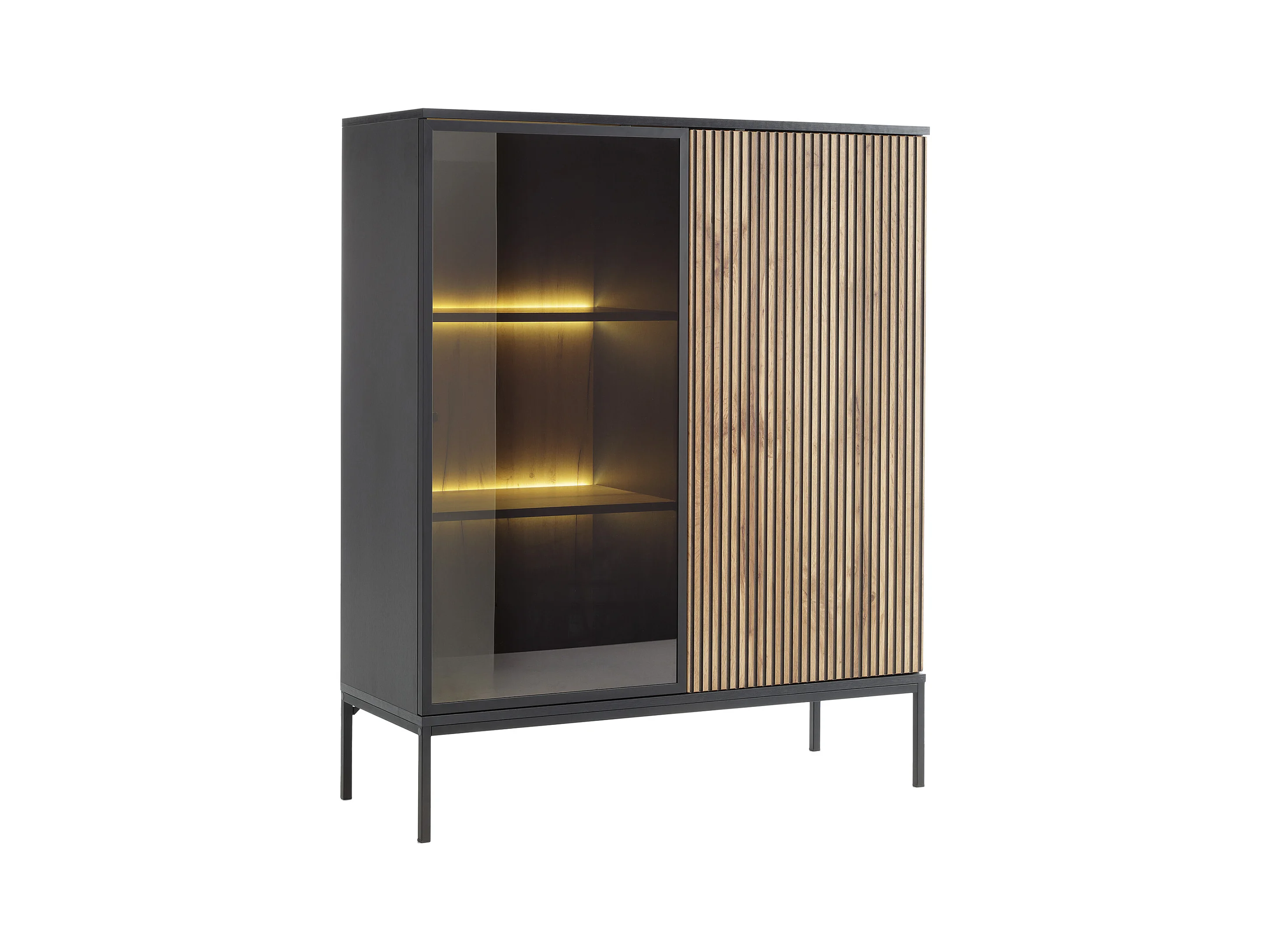 Vitrinenschrank - 2 Türen - mit LED-Beleuchtung - MDF & Rauchglas - Schwarz & Holzfarben - OVILA