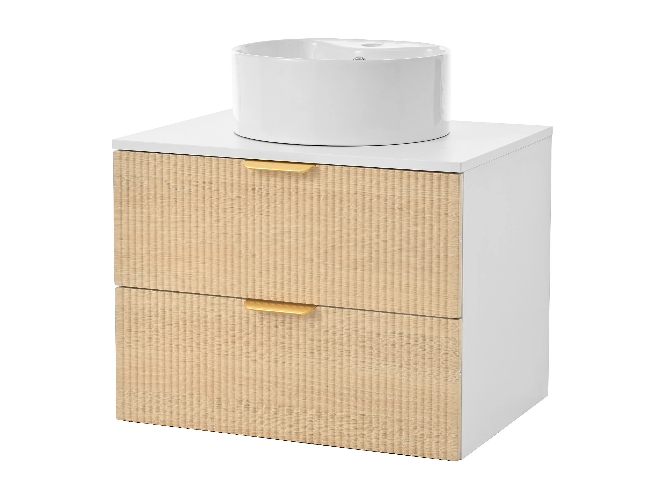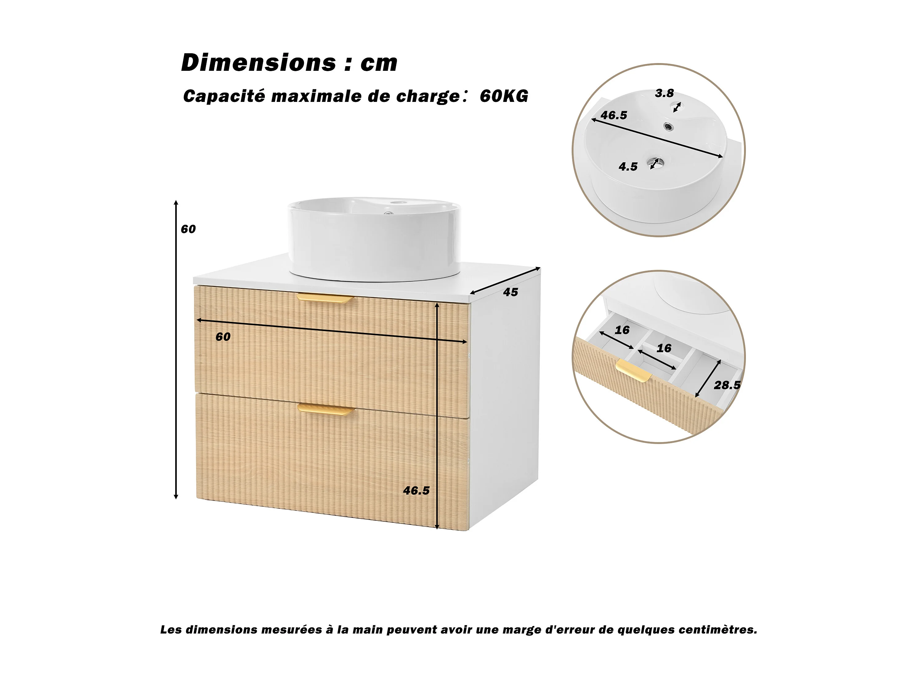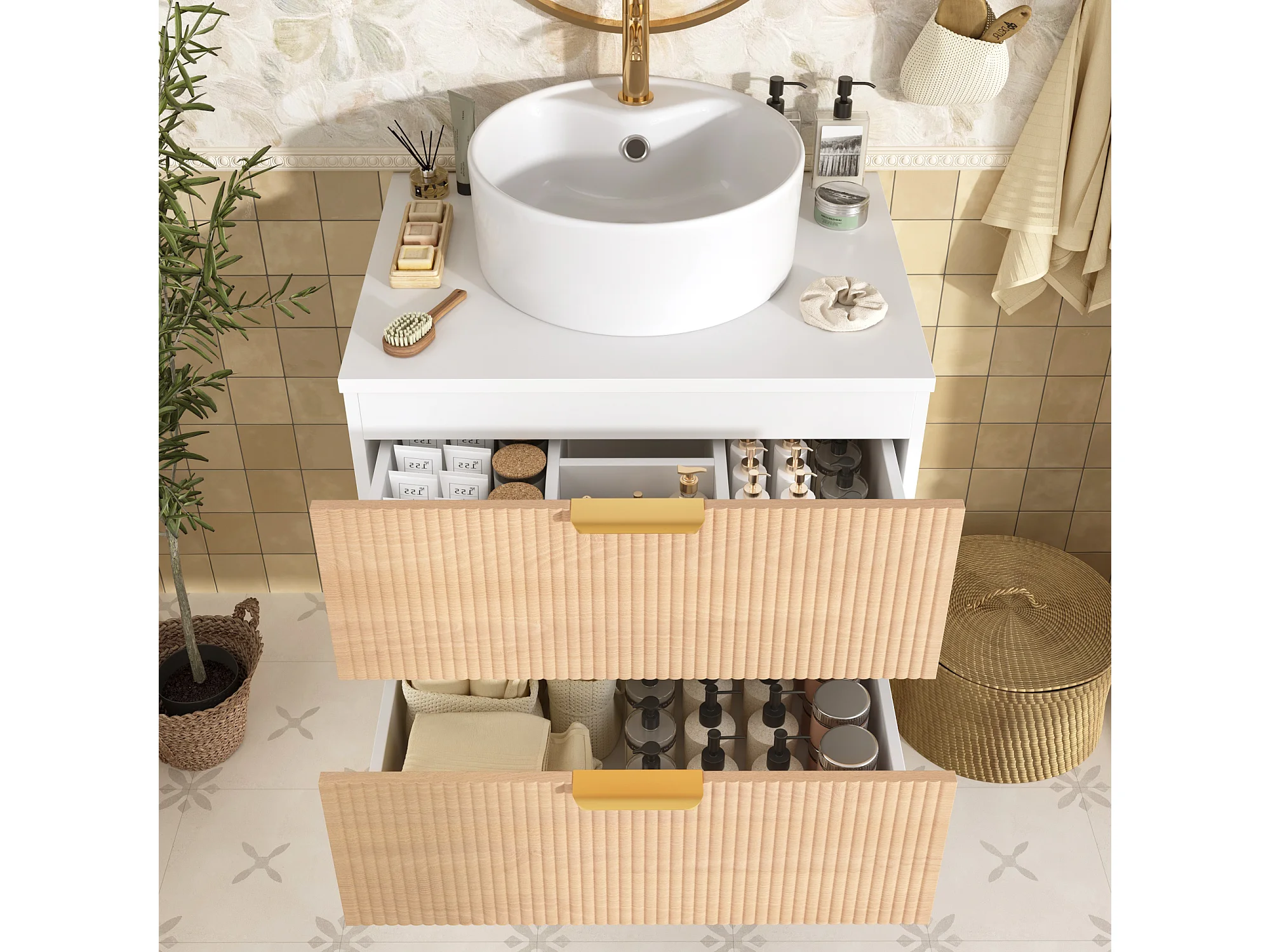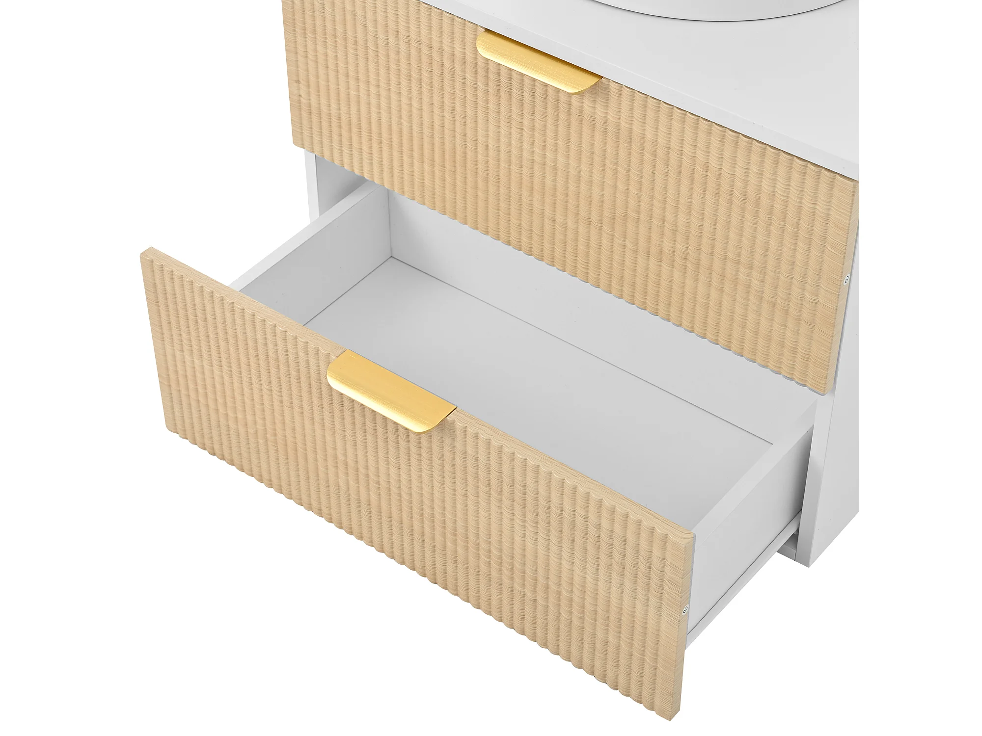 Wandhängender Badezimmerschrank - mit einem runden Keramikwaschbecken - Holzmaserung-Optik - mit 2 Schubladen - weiß + Natur​ (Wasserhahn nicht inbegriffen)