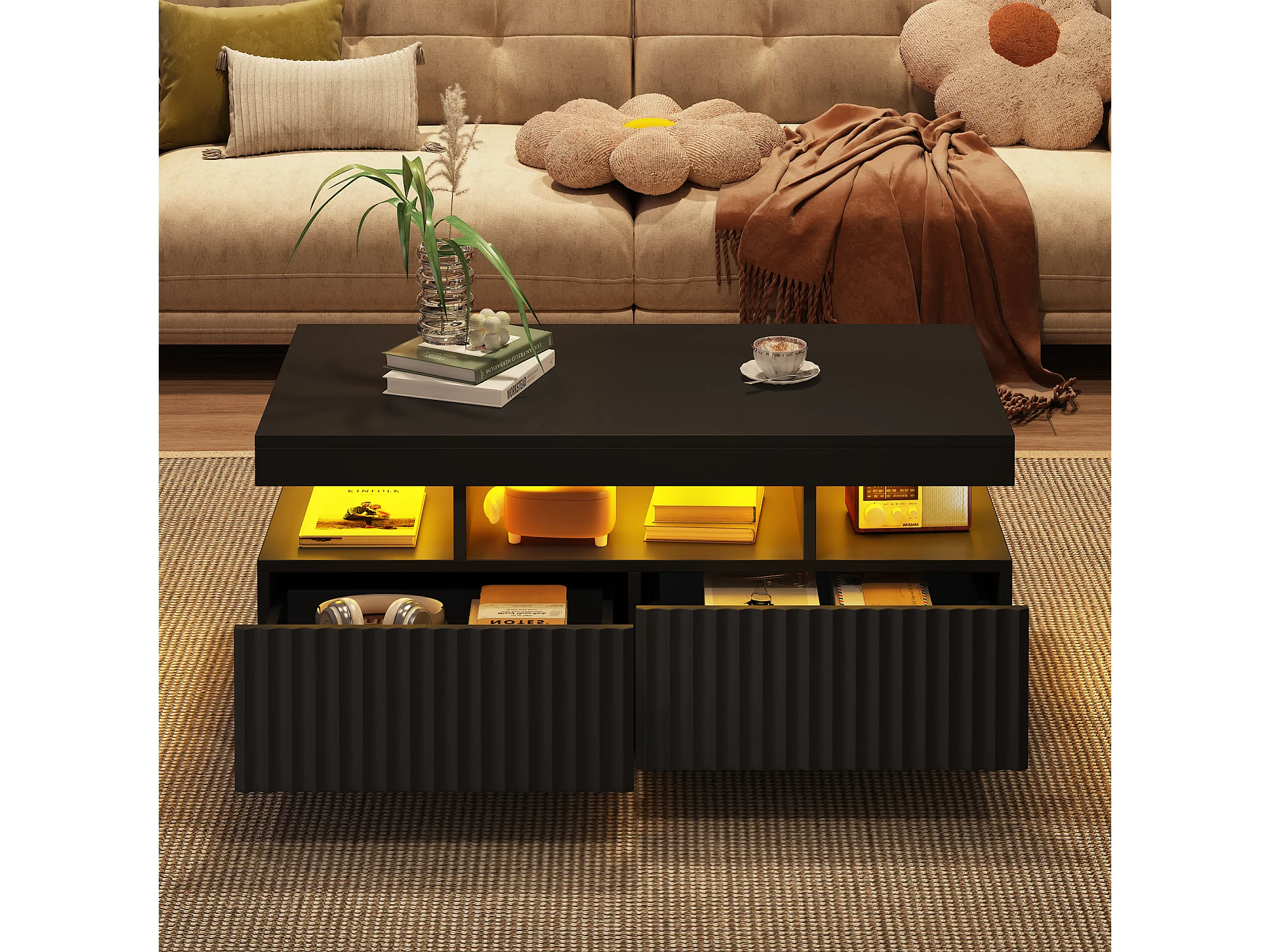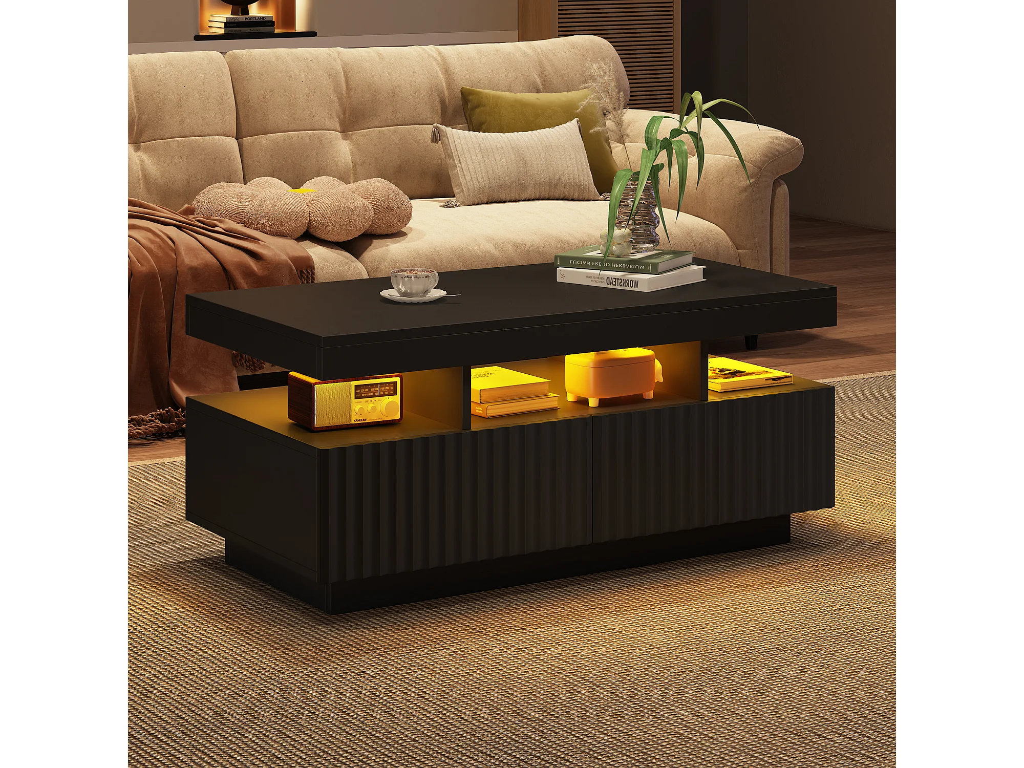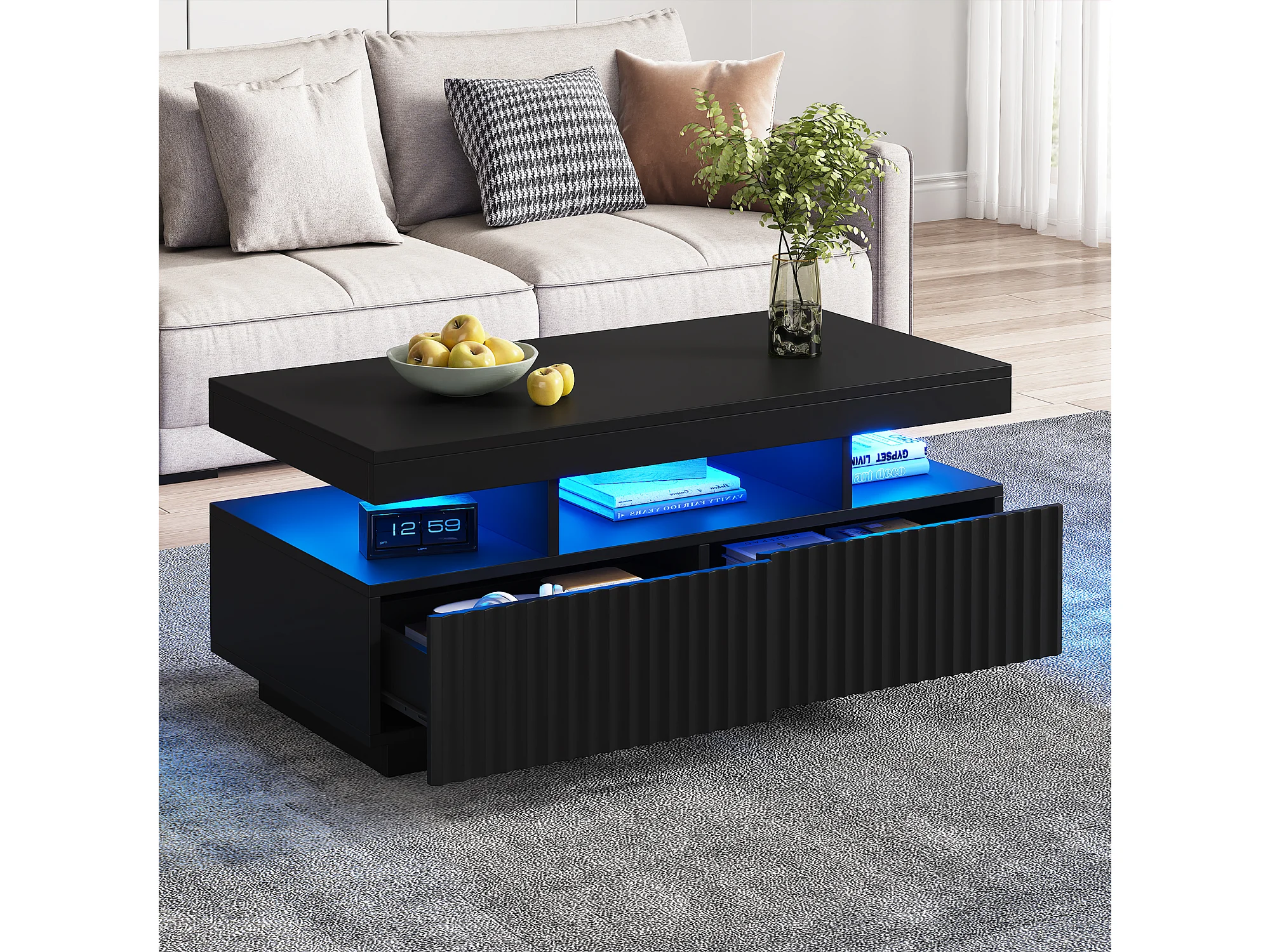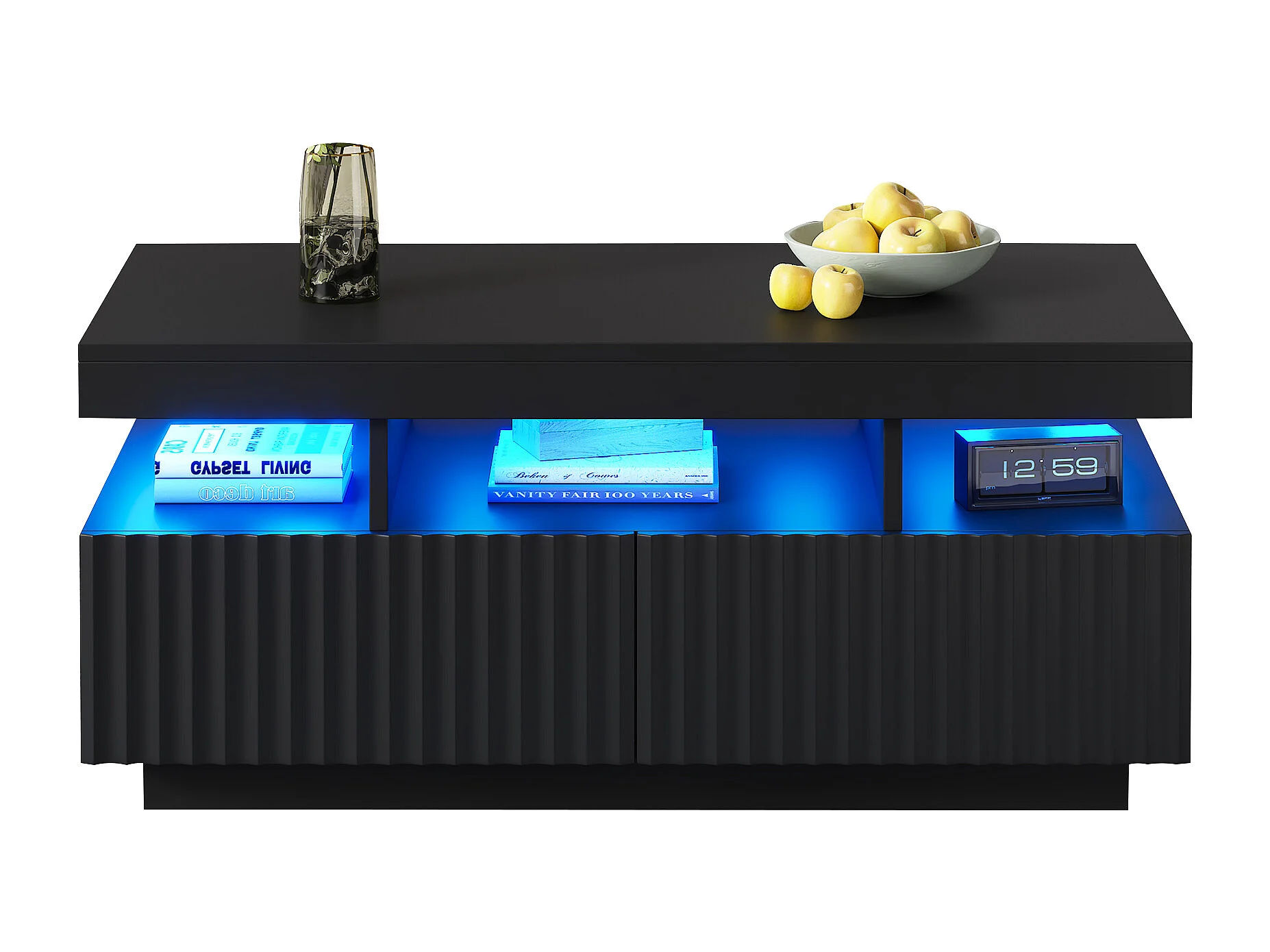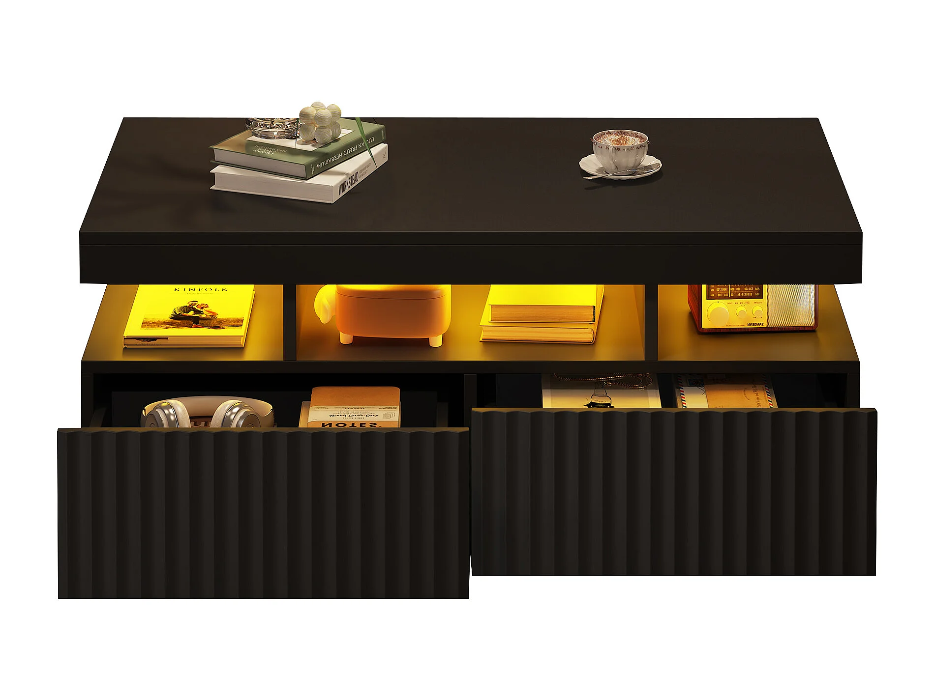 Wohnzimmer-Couchtisch – 100 x 50 x 45 cm – mit 2 Schubladen + LEDs – Spanplatte – schwarz
