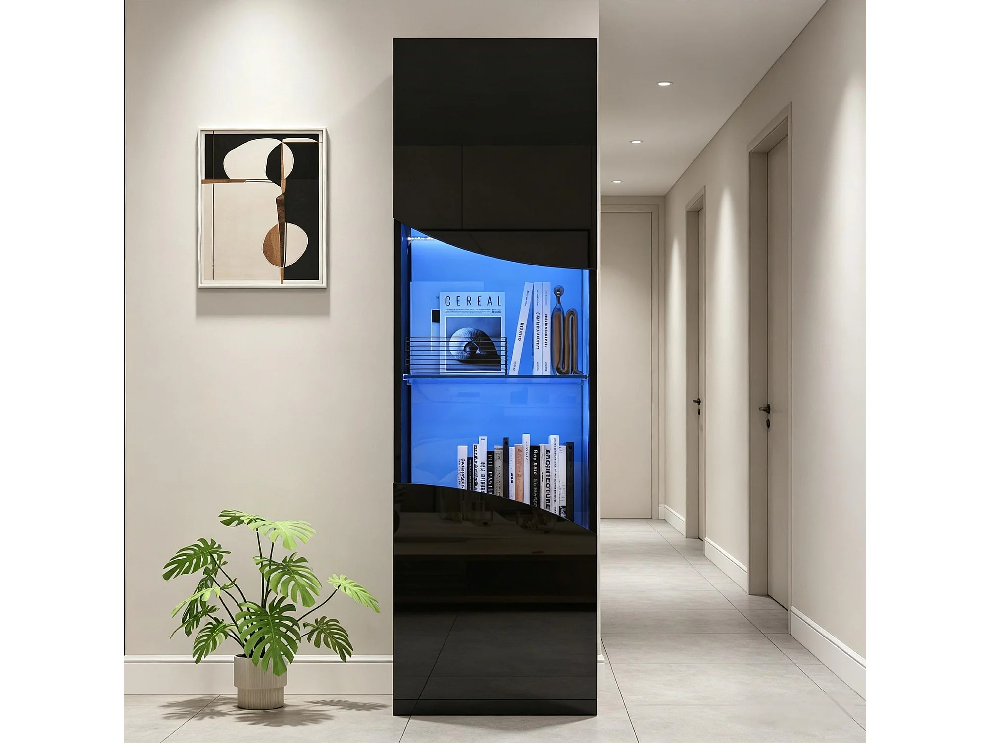 Wohnzimmer-Vitrine – 50 x 35 x 165 cm – mit hochlackierten Türen und LEDs – Spanplatte – schwarz